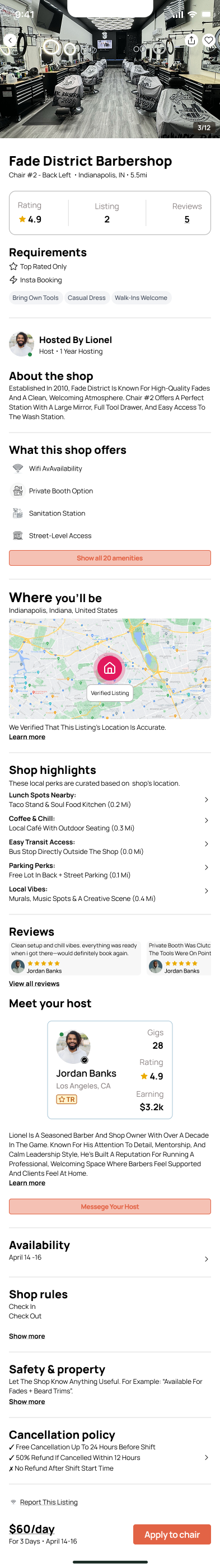 Verified profiles, shop ratings, and clear requirements were prioritized early in the flow to reduce hesitation before applying or booking.