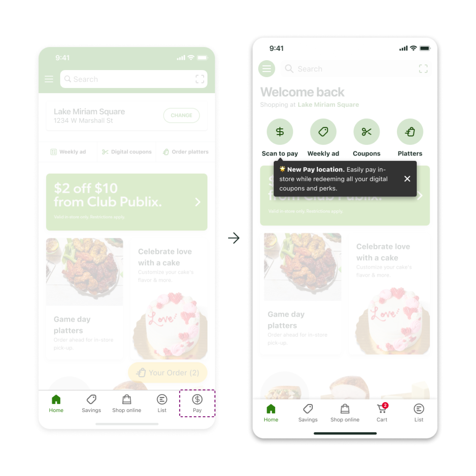A brief in-app cue explains the new PAY location upon first use.